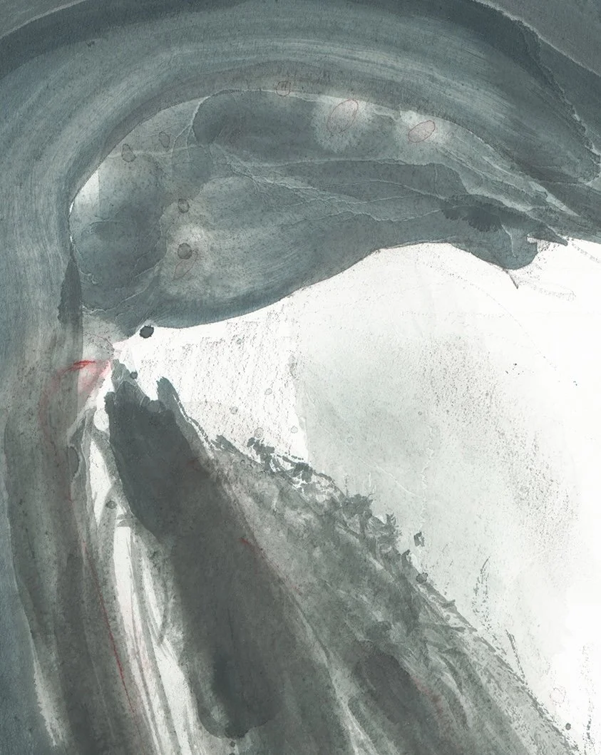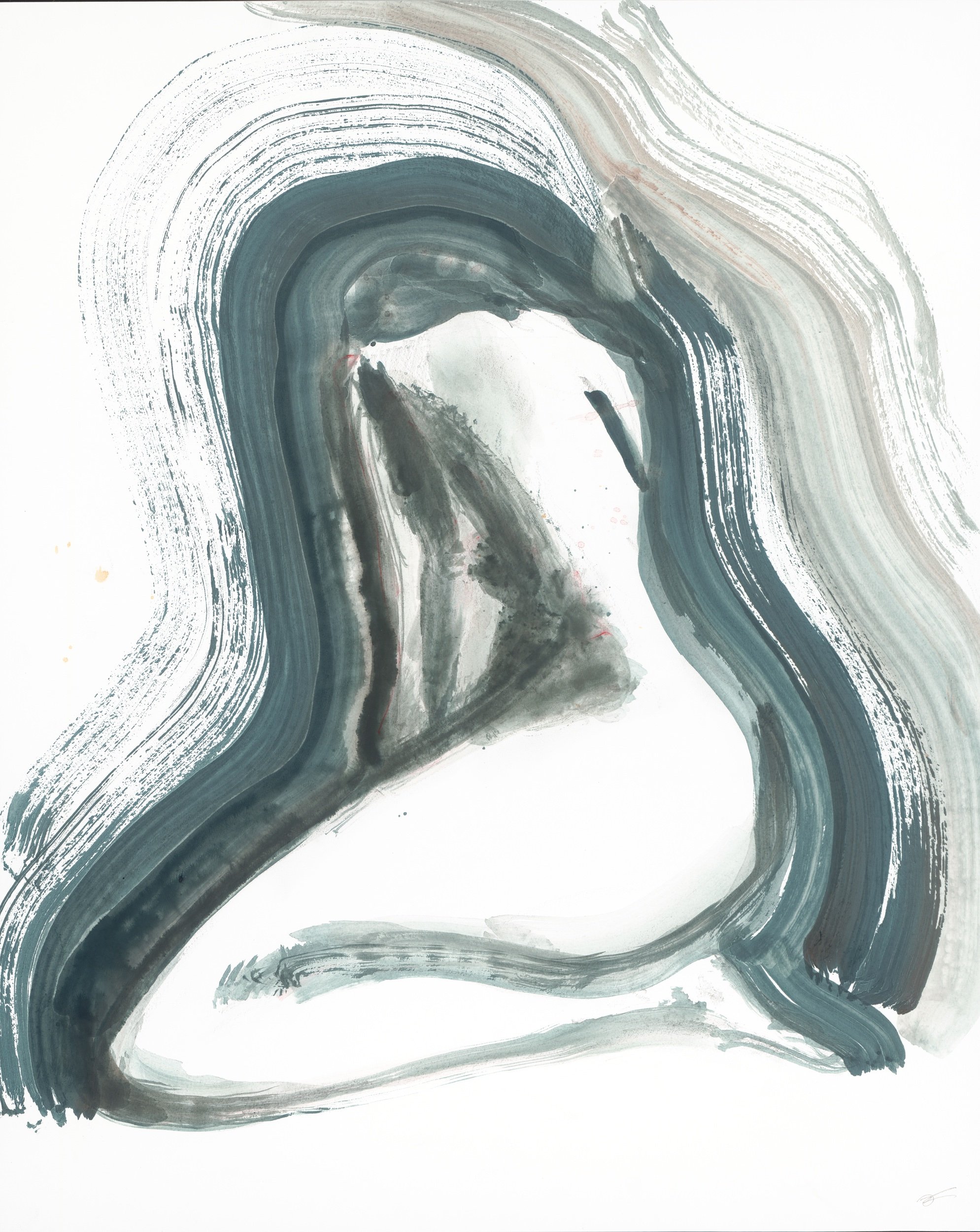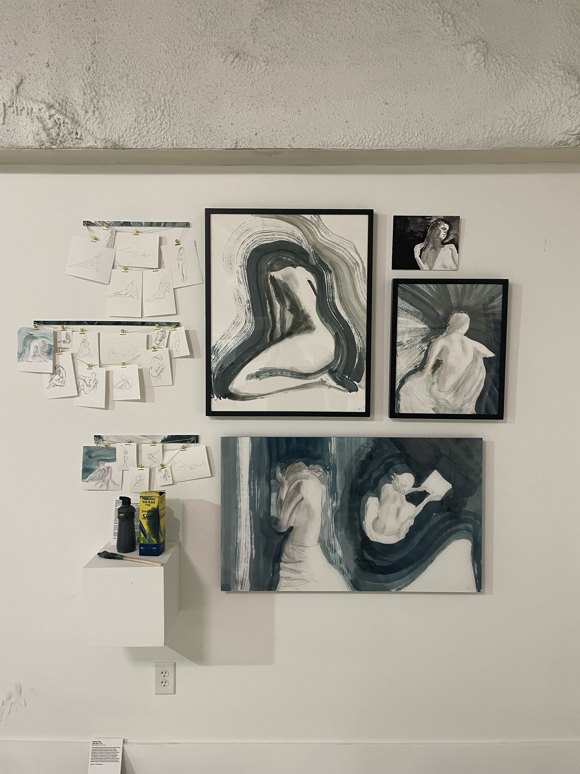 Meditations in Blue explores rendering as the tension between incompleteness and resolution. Blue-black ink layers thick brushtrokes over partially penciled figures, one absorbed in thought, the other in books. The unpredictable textures and stains become part of the process, embracing imperfection. The figures were chosen at random from hundreds of drawings and expositional studies, resisting polish and finality. This leaves space for ambiguity, reflecting the simultaneity of isolation and solace. Each unfinished line and smudge invites the viewer to make their own interpretive connections.